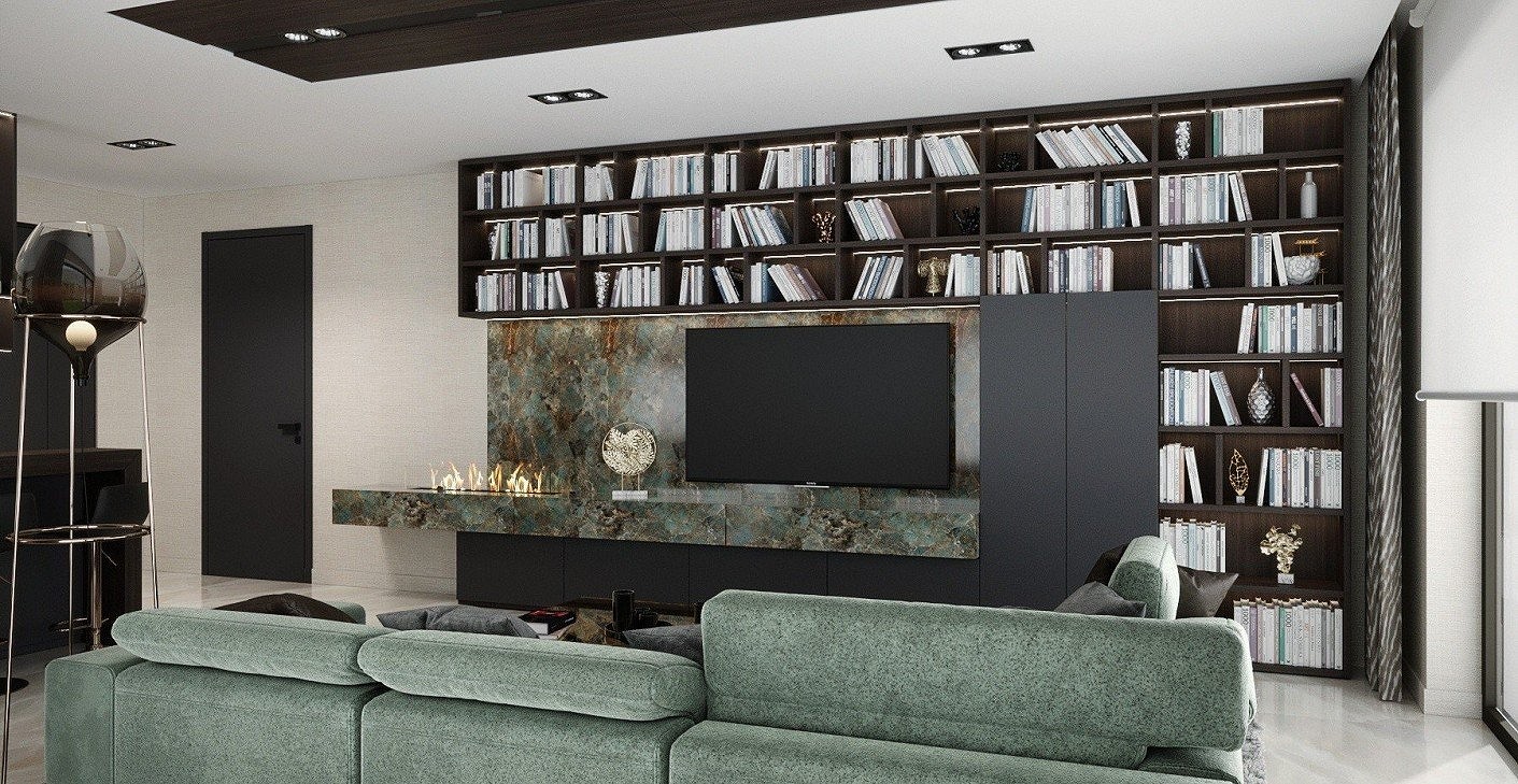 I designed a spacious-feeling interior for a couple who love reading, despite the small floor area. They requested a modern, contemporary design with darker colors, creating an elegant and functional living space.