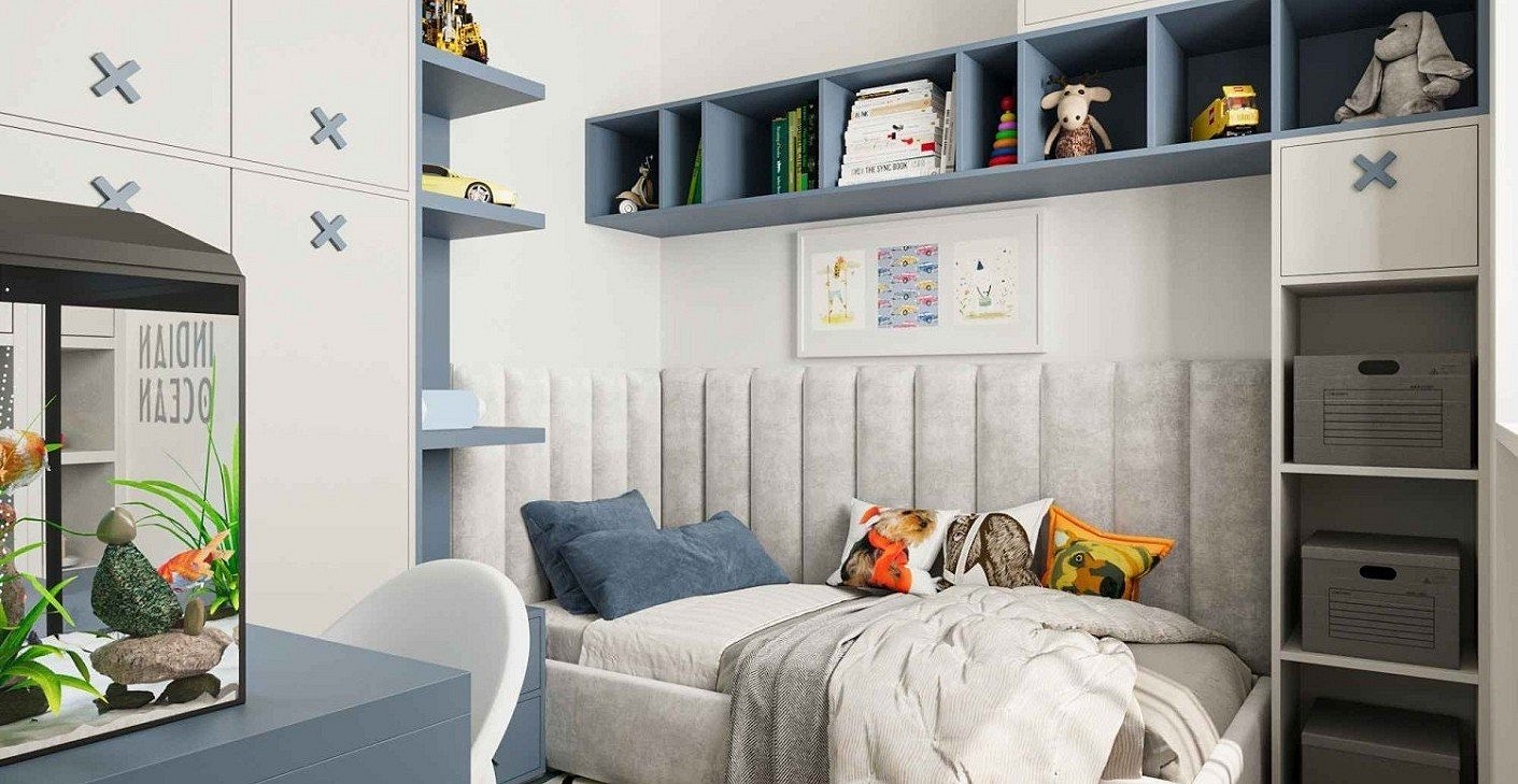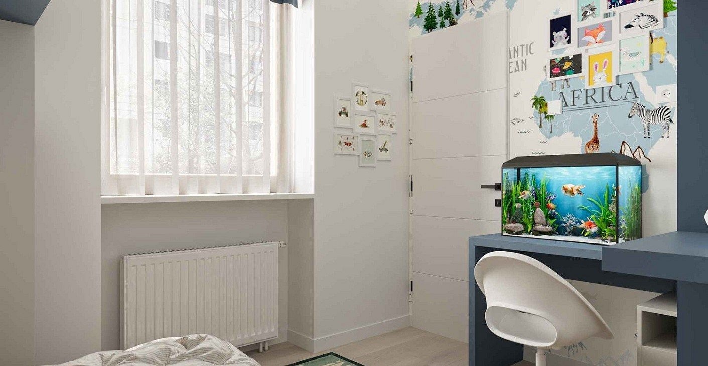 A mother living in Budapest asked me to design a room for her child that would serve her son long-term, allowing him to play and create comfortably as he grows. The room is only 7 square meters, which made it a challenge to fit everything requested: plenty of storage, a 90x200 bed with a storage compartment, a desk, and even space for an aquarium. During the design process, I consulted with the client multiple times, discussing every detail during the draft plans to create the most perfect interior.