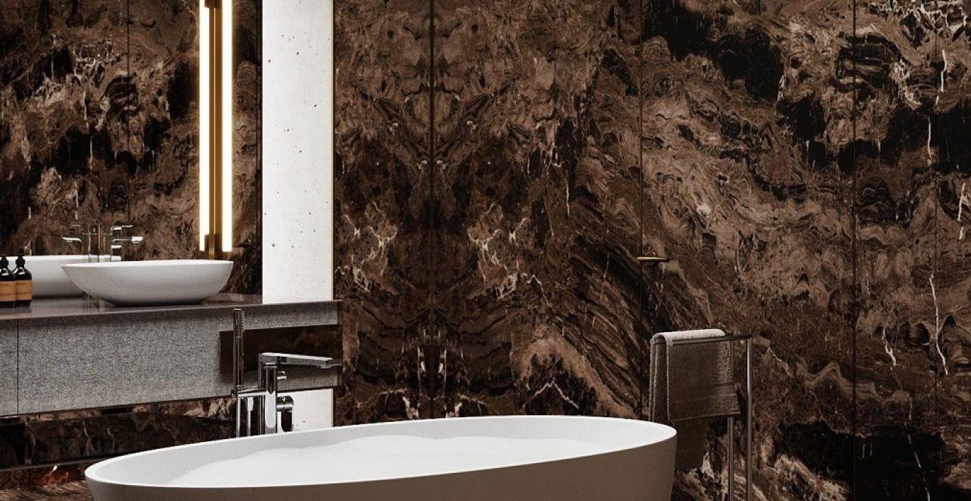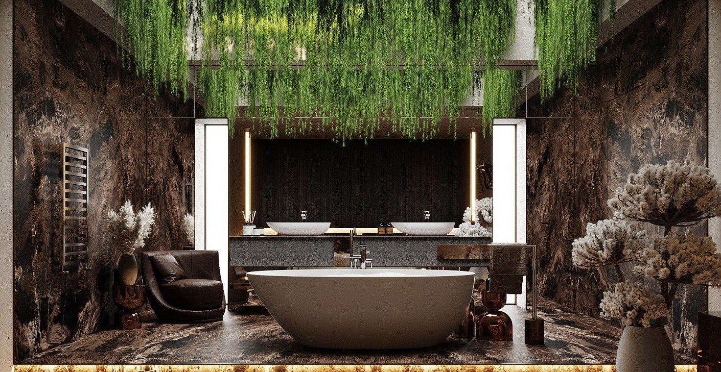 A megrendelőm egy harmincas évei közepén járó egyedülálló férfi, aki egy multinacionális cégnél dolgozik középvezetőként. Mivel sok időt tölt munkahelyén, fontos számára, hogy egyegy fárasztó nap után igazi kikapcsolódásra leljen otthonában, hiszen ritkán jut ideje elutazni. Emiatt döntött hálószobája és az ahhoz tartozó fürdőszoba átalakítása mellett. Megrendelőm nagy hangsúlyt fektet megjelenésére és öltözködésében is a minőségi darabokat részesíti előnyben. Határozott, mégis romantikus jellem, akinek céljai mellett az élet élvezete is fontos. A tervezés során szem előtt tartottam személyiségét és preferenciáit, így az enteriőr maszkulin, mégis harmonikus és elegáns stílusjegyeket hordoz. A nagyvonalú és felemelő design egy élhető és használható térben valósult meg, melyet magas minőséget képviselő anyagok és termékek egészítenek ki. A tervezési tematikám az Arezzo Silk kád köré épült, ez lett az otthoni oázis középpontja. Ezt a finoman letisztult kádat szerettem volna egy olyan környezetbe tenni, amely méltón képviseli és kiemeli a kád nemes eleganciáját. A fürdőszobát hozzákapcsoltam a hálószobához, így annak meghitt hangulatát egy nagyvonalú, különleges fürdőszoba koronázza meg. A Silk kádat természetes fénybe helyeztem, amely felülről bevilágítva fényponttá varázsolja a helyiségen belül. A természetet képviselő elemek hívogatóvá és relaxációs élménnyé varázsolják a kád használatát. A kád köré luxus és minőségi anyagokat használtam: burkolatként a Marazzi nagyméretű Grande Marble Look Frappuccino barna színét alkalmaztam, amely kellőképpen megkoronázza a Silk kád szépségét. A bronzos és a füstös árnyalatokat a természetes zöld növényzet bevonása és a kívülről beáradó természetes fény enyhe kontraszttal teszi lágyabbá és egészíti ki. Összességében egy elegáns és harmonikus, mégis különleges enteriőrt álmodtam meg az Arezzo Silk kádjával, ezzel is kifejezve, hogy az álmok valósággá válnak: megrendelőm a sietős hétköznapok tengerében is nyugalomra lelhet saját szentélyében.
