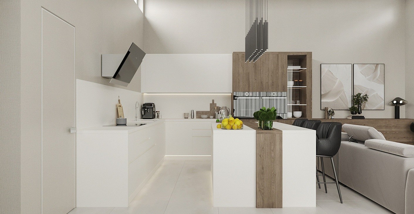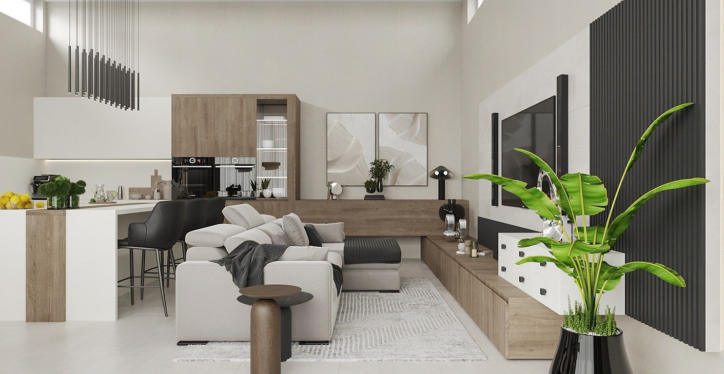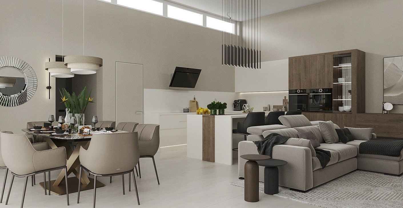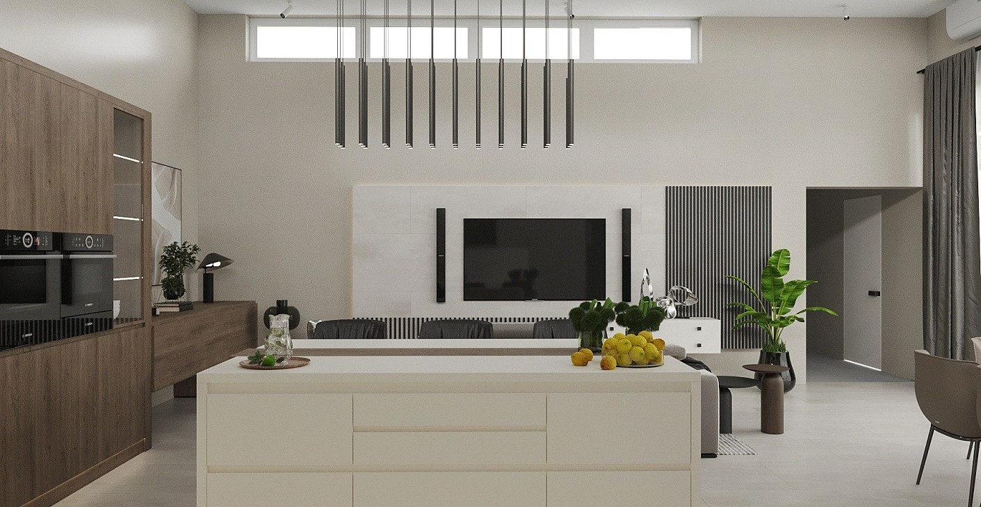 Debrecenben épül ez a mai kornak megfelelően , magas belmagassággal rendelkező nappali-konyha-étkező élettér, amely 50 négyzetméteres .Meleg anyag használatot kértek, barna , krém-bézs színeket, matt felületeket . Az alapterület nem túl nagy , így átgondolt tervezéssel sikerült egy modern, harmonikus otthont megalkotnom.
