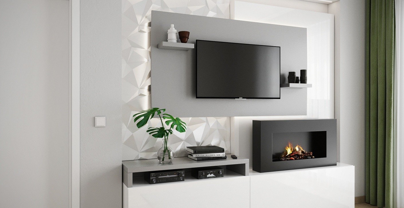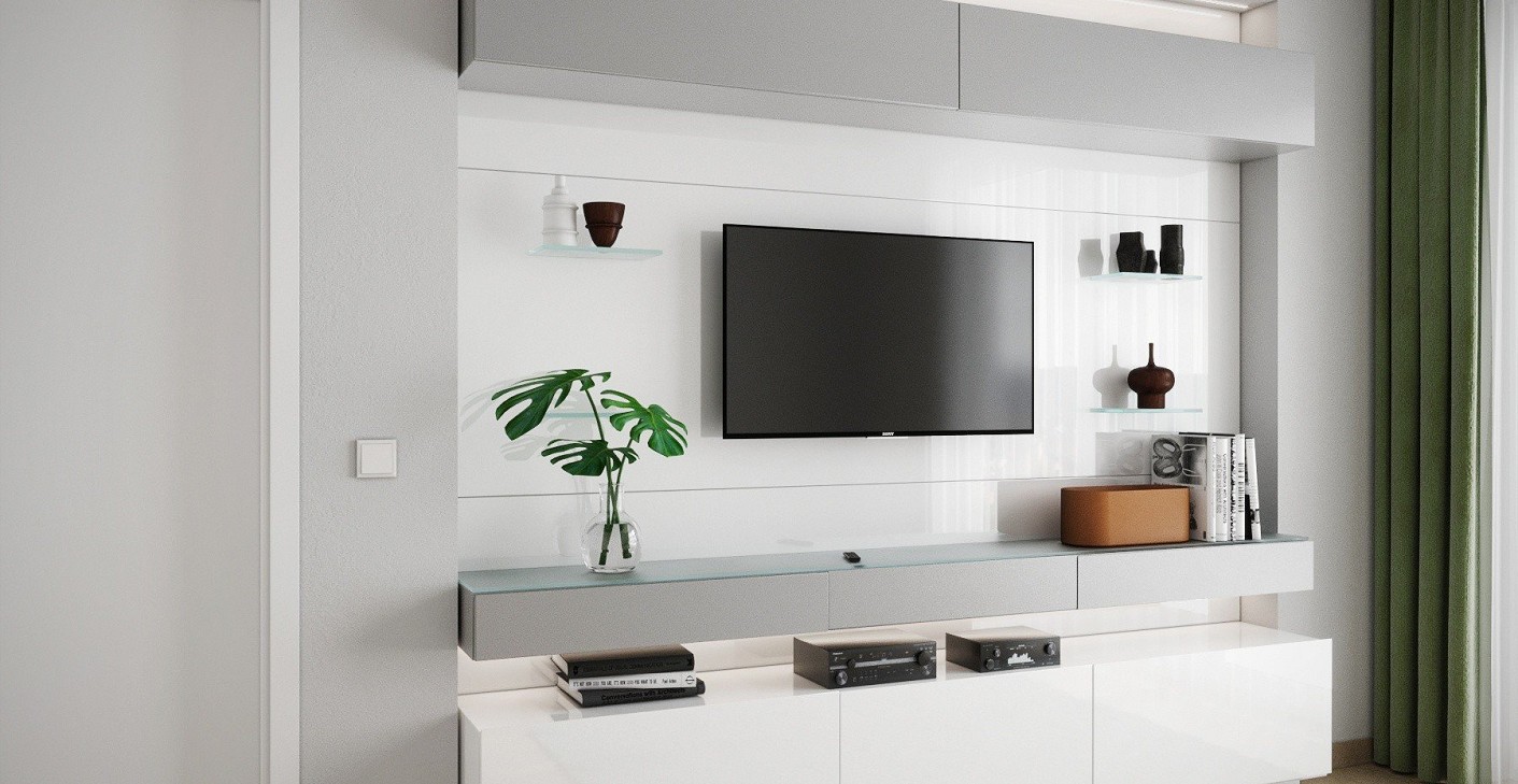 Egy fiatal pár kért fel, hogy tervezzek a meglévő lakásukba egy tárolásra is alkalmas média falat. Igényeiknek megfelelően szürke és magasfényű fehér színeket használtam.